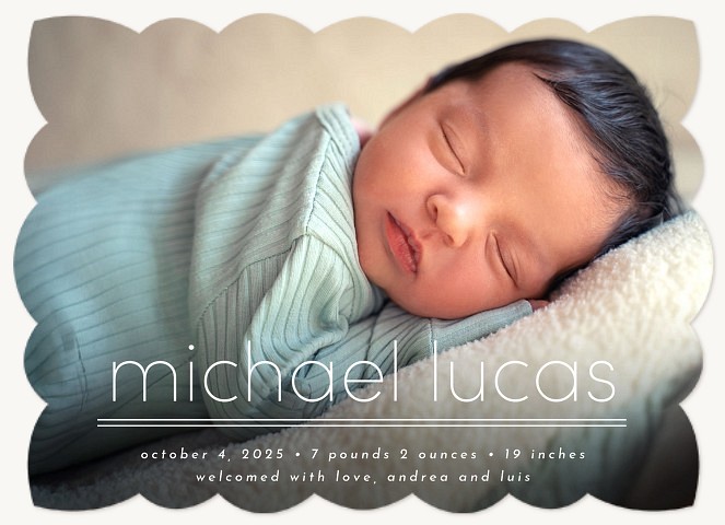 Celebrate your new arrival with this sophisticated birth announcement featuring a stunning full-bleed photo layout. The design showcases elegant white serif typography in italicized styling against a soft neutral gradient background, with clean dividing lines that create perfect separation between your baby's details. This timeless layout beautifully frames your newborn photos while creating a cherished keepsake for family and friends.