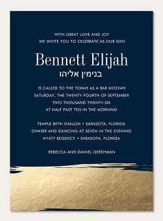 Celebrate this sacred milestone with our sophisticated Bar Mitzvah invitation featuring a deep navy background adorned with a striking gold faux metallic accent. The refined typography and traditional layout perfectly honor this meaningful Jewish coming-of-age celebration, while premium paper options and customizable Hebrew text ensure a truly personal touch.