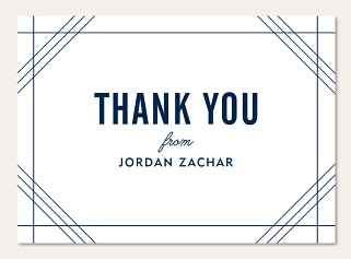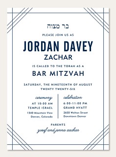 Honor this sacred milestone with our contemporary Bar Mitzvah invitation featuring elegant geometric corner lines and sophisticated navy typography. The balanced layout harmoniously combines traditional Hebrew text with modern design elements, perfect for this meaningful celebration. Customize with your choice of premium papers and finishing options.
