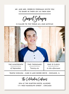 Celebrate this meaningful milestone with our contemporary Bar Mitzvah invitation featuring sophisticated typography and clean, structured design elements. The modern layout perfectly balances script and sans-serif fonts with organized information blocks. Choose from premium paper options and customize with your event details for a truly memorable announcement.