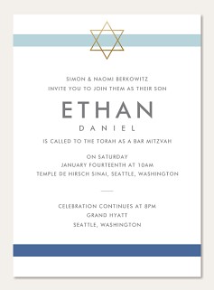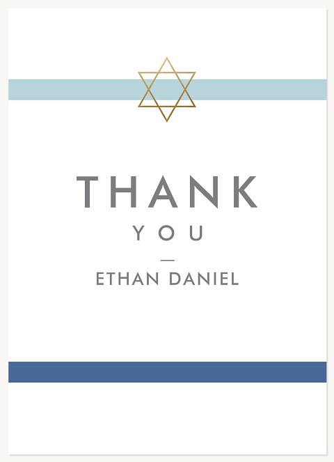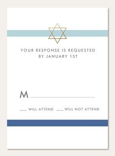 Elevate your Bar Mitzvah celebration with this sophisticated RSVP card featuring a striking gold faux foil Star of David. The minimalist design pairs soft blue and navy accents with modern typography for a contemporary yet meaningful approach. Available on premium cardstock with customizable response options.