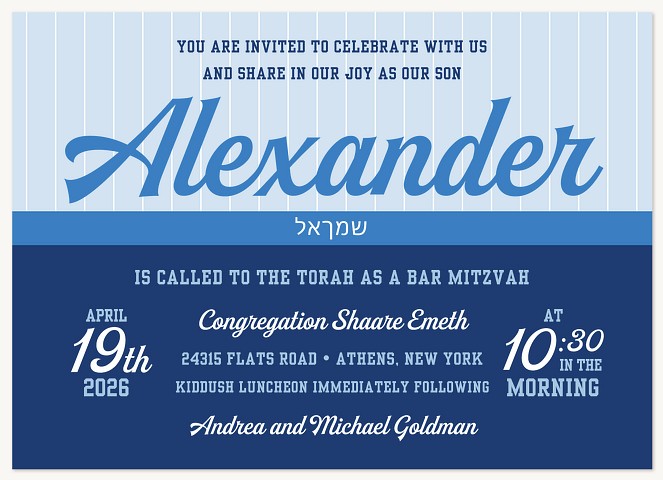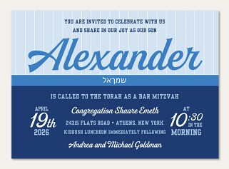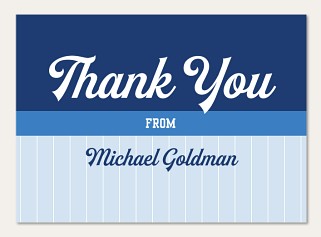 Express heartfelt thanks with these contemporary Bar Mitzvah thank you cards featuring bold script typography and a dynamic navy-to-blue gradient design. The modern sporty aesthetic is enhanced by subtle pinstripes and clean layout. Professionally printed on premium cardstock with customizable interior and reverse side.