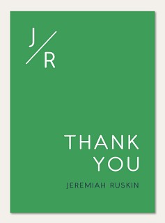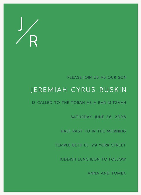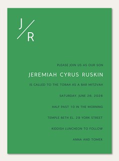 Express your gratitude with sophisticated style in this contemporary Bar Mitzvah thank you card. The striking green background features a minimalist diagonal monogram design, complemented by clean, modern typography. Professionally printed on premium cardstock with customizable options for a perfectly polished presentation.