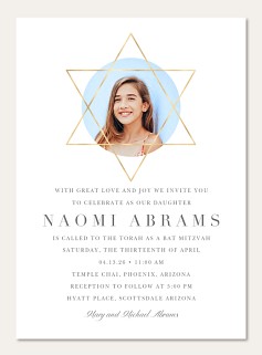 Celebrate this sacred milestone with a Bat Mitzvah invitation that perfectly balances tradition and contemporary style. A striking gold Star of David frames your chosen photo against a serene light blue circle, while elegant serif typography adds gravitas to the announcement. Available on premium cardstock with optional pearl shimmer finish to enhance the faux metallic accents.