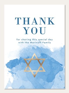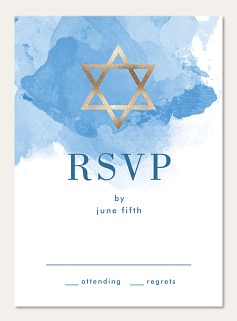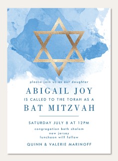 Celebrate this sacred milestone with a Bat Mitzvah invitation that perfectly balances tradition and contemporary style. A striking faux metallic gold Star of David shimmers against ethereal blue watercolor washes, while clean typography adds modern elegance. Choose from premium paper options with customizable finishing touches to create an invitation worthy of this meaningful celebration.