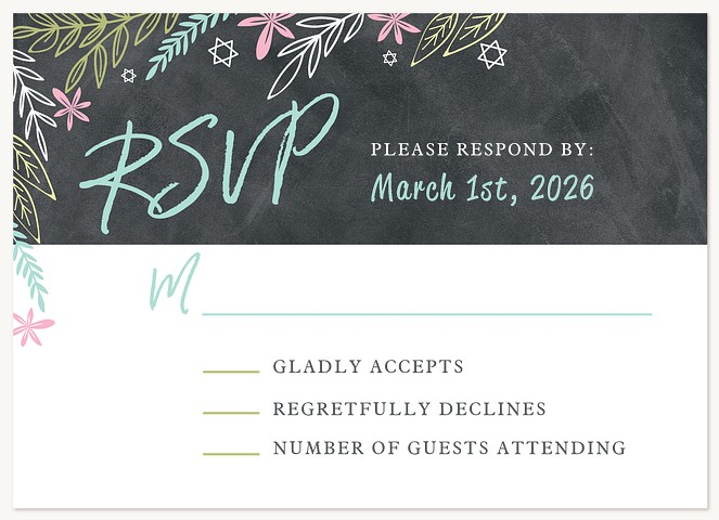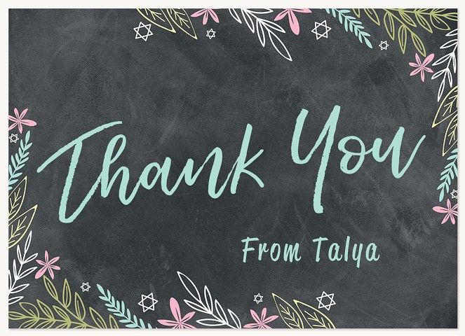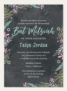 Celebrate this meaningful milestone with a Bat Mitzvah invitation that perfectly balances tradition and contemporary style. Delicate mint and pink florals frame a chalkboard backdrop, while scattered Stars of David add sacred symbolism. Personalize this design on premium cardstock with your choice of luxurious finishes.