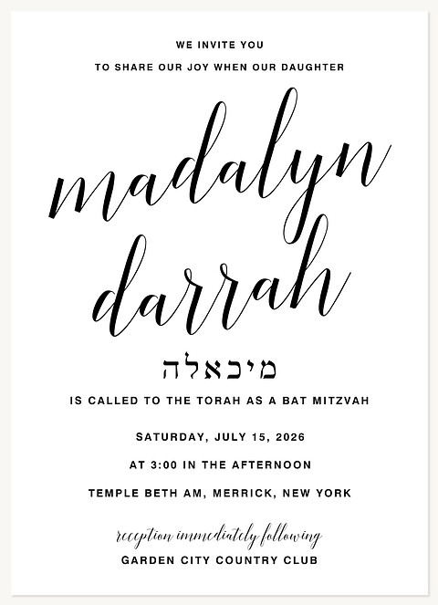 Elevate your Bat Mitzvah celebration with this elegantly designed RSVP card featuring flowing script typography and clean modern details. The minimalist black and white design creates a sophisticated aesthetic that perfectly complements any invitation suite. Available in premium cardstock options with customizable finishing touches.