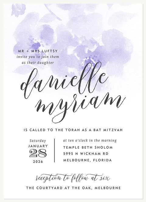 Capture responses for your Bat Mitzvah celebration with this ethereal RSVP card featuring delicate watercolor violets in soft purple hues. The elegant script typography and minimalist layout create a sophisticated design that perfectly complements your invitation suite. Available on premium cardstock with customizable response options.