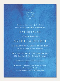 Elevate your Bat Mitzvah celebration planning with this sophisticated RSVP card featuring geometric Star of David accents in brilliant blue. The clean, modern layout pairs contemporary design with traditional symbolism, while premium cardstock options ensure a lasting impression.