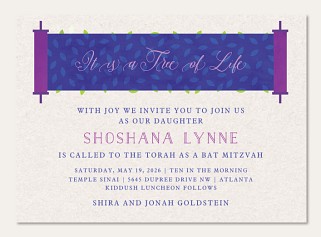 Capture the sacred spirit of your Bat Mitzvah celebration with this elegantly designed RSVP card. The scroll-inspired banner features delicate leaf patterns in deep blue with purple accents, while sophisticated script typography adds graceful formality. Choose from premium paper options with customizable finishing touches to perfectly complement your invitation suite.