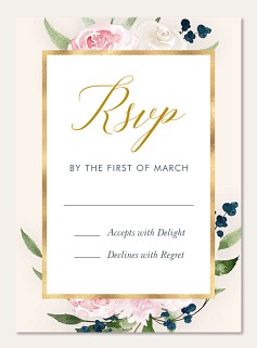 Elevate your Bat Mitzvah celebration with this enchanting RSVP card featuring delicate watercolor florals and gleaming gold accents. Pink roses and navy berries frame an elegant gold faux foiled border, while crisp typography ensures clear response options. Available on premium cardstock with your choice of luxurious finishes.