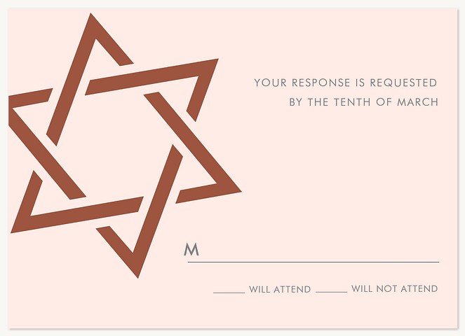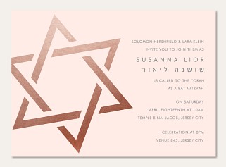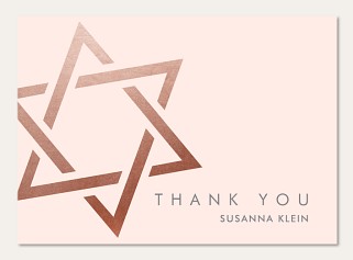 Express your gratitude with contemporary elegance in this rose gold faux foil Bat Mitzvah thank you card. The minimalist design features a striking Star of David rendered in faux metallic tones against a soft blush background. Printed on premium cardstock with customizable interior and reverse side, this sophisticated design perfectly balances modern style with meaningful tradition.