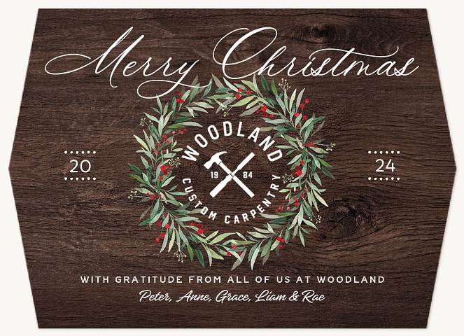 Blend timeless tradition with rustic charm in this distinctive business holiday card. A lush wreath of winter greenery and berries frames your company emblem against rich wood grain, while elegant calligraphy adds seasonal warmth. Customize with your business details on premium cardstock with choice of luxurious finishes.