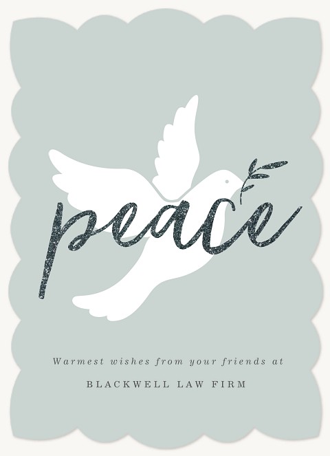 Send a message of serenity with this sophisticated business holiday card featuring a graceful dove and sparkling hand-lettered typography. The monochromatic design pairs a white dove silhouette with faux glittering 'peace' text against a soft gray background. Choose from premium paper options and multiple sizes to create the perfect professional greeting.