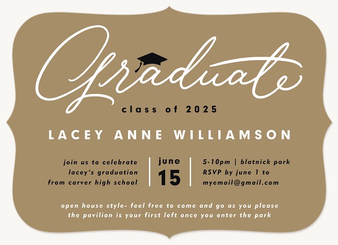 Celebrate academic achievement with this elegantly modern graduation card featuring a minimalist mortarboard accent and flowing script typography. The clean layout and warm neutral palette create a sophisticated backdrop for your celebration details. Customize with your choice of premium papers and finishing options for a truly distinctive announcement.