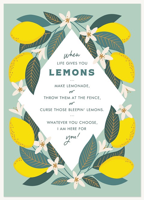 Turn life's sour moments into something sweet with this witty greeting card featuring fresh botanical lemons and delicate white blooms on a serene sage background. The playful message is framed by a sophisticated diamond border surrounded by vibrant citrus illustrations. Printed on premium cardstock with customizable interior and reverse side.