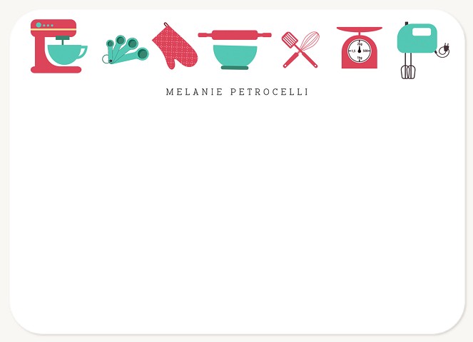 Express your culinary personality with these charming personalized stationery cards featuring an array of classic kitchen essentials. Cheerful red and turquoise icons of stand mixers, measuring spoons, and baking tools create a delightful header design. Perfect for recipe sharing, kitchen correspondence, or adding a dash of personality to any note.