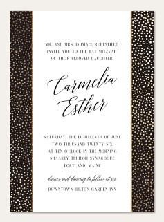 Elevate your Bat Mitzvah celebration with this sophisticated RSVP card featuring shimmering gold faux foil dots and graceful calligraphy. The scalloped edge and minimalist design create an air of refined elegance, while premium cardstock options ensure a luxurious presentation worthy of this meaningful milestone.