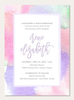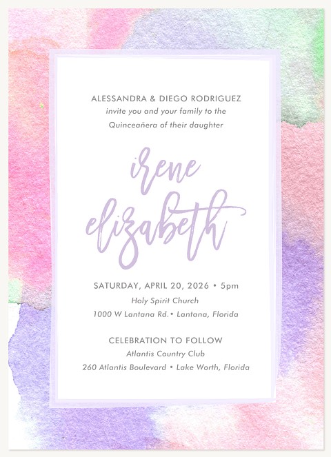 Capture the romance of your Quinceañera celebration with this dreamy RSVP card featuring a soft watercolor ombre background in pastel pink, purple, and mint green. The elegant white frame showcases graceful script typography in gentle lavender. Available in classic or premium cardstock with multiple finish options to perfectly complement your invitation suite.