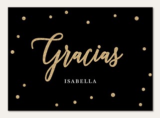Celebrate this cherished tradition with a Quinceañera invitation that radiates sophistication. The dramatic black background showcases hand-lettered gold faux glitter typography and scattered shimmer dots, creating an air of elegance and celebration. Choose from premium paper options and finishing touches to create an invitation worthy of this momentous milestone.
