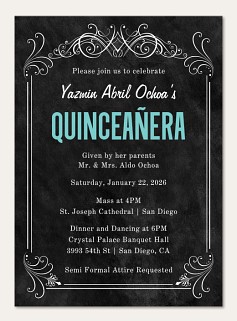Mark this momentous celebration with our sophisticated Quinceañera invitation featuring an elegant chalkboard design adorned with intricate white flourishes and striking turquoise accents. The ornate frame and classic typography create a perfect balance of tradition and modern style, while premium paper options ensure a lasting keepsake of this special milestone.