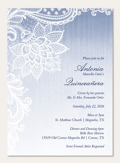 Celebrate this cherished milestone with our ethereal Quinceañera invitation featuring intricate white lace patterns against a dreamy blue-gray ombre background. The elegant floral motif and sophisticated typography create a perfect balance of tradition and modern grace. Available in premium paper options with customizable details to create your perfect announcement.