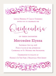 Celebrate this cherished milestone with an elegant Quinceañera invitation adorned with graceful pink filigree flourishes and ornate border details. The sophisticated script typography and centered layout create a perfect balance of tradition and modern style. Available on premium cardstock with optional pearl shimmer finish to add an extra touch of luxury.