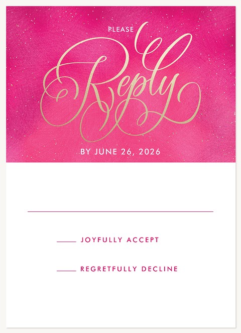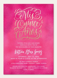 Celebrate this cherished tradition with a Quinceañera invitation that radiates elegance and joy. The stunning gold calligraphy dances across a rich pink background adorned with delicate sparkles. Available in premium paper options with shimmer finishes to create an unforgettable announcement worthy of this momentous celebration.