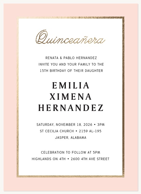 Express your gratitude with elegance through these sophisticated Quinceañera thank you cards featuring a luxurious gold faux foil frame against a soft blush background. The classic script typography adds a touch of timeless grace, perfectly reflecting the significance of your celebration. Customize your message on premium cardstock with your choice of matte, glossy, or pearl shimmer finish.