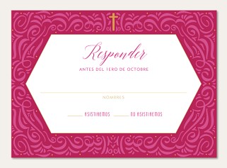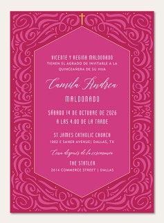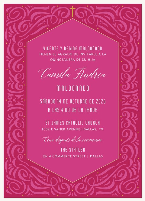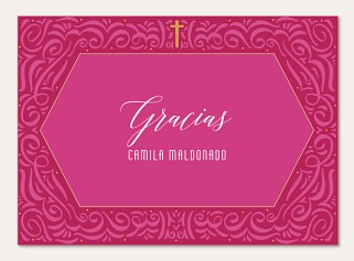 Express heartfelt gratitude with this striking Quinceañera thank you card featuring an elegant hexagonal frame adorned with intricate flourishes. The rich magenta design showcases a delicate gold cross and sophisticated swirl patterns, perfectly balancing traditional elements with modern style. Customize your message on premium cardstock with choice of pearl shimmer, matte, or glossy finish.