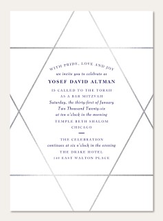 Mark this sacred milestone with a Bar Mitzvah invitation that perfectly balances tradition and contemporary style. The striking geometric Star of David in lustrous silver faux foil creates an sophisticated frame for your celebration details. This elegant design offers premium paper options and customization to create an invitation worthy of this momentous occasion.