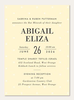 Celebrate this meaningful milestone with our elegantly designed Bat Mitzvah invitation featuring delicate white polka dots on a warm cream background. The classic typography creates a perfect balance of tradition and style. Available in premium cardstock options with customizable text to capture every detail of this special day.