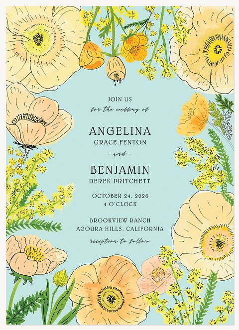 Capture responses elegantly with this botanical RSVP card featuring delicate hand-illustrated California poppies in soft peach and sunny yellow. The flowing script and clean layout make collecting guest responses effortless, while the scalloped border adds a graceful finishing touch.