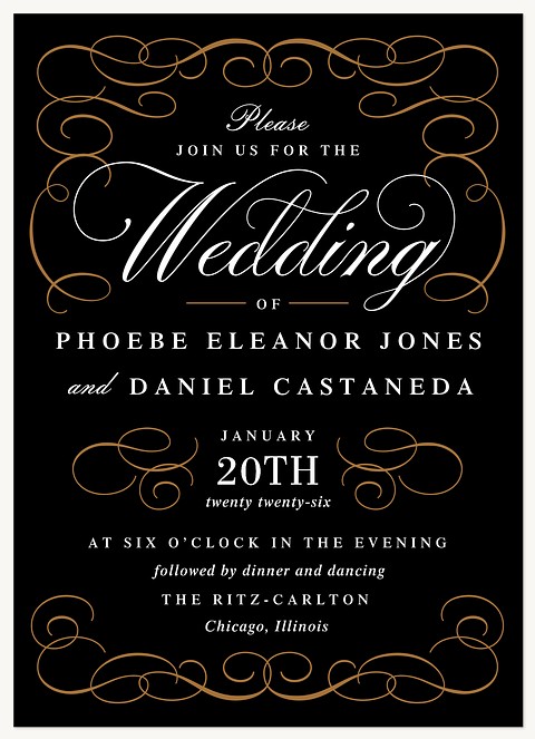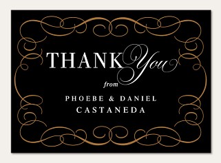 Express your gratitude with timeless sophistication through this striking thank you card. The dramatic black background showcases an intricate copper flourish border framing crisp white typography in an elegant serif and script combination. Printed on premium cardstock with customizable interior and reverse side, this design elevates your message of appreciation.