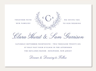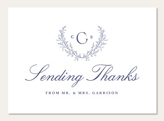 Express heartfelt gratitude with this elegantly designed thank you card featuring a classic monogram crest adorned with delicate laurel wreaths. The flowing script typography and traditional layout create a timeless aesthetic perfect for any occasion. Customize with your choice of premium cardstock and finishing options for a truly personal touch.