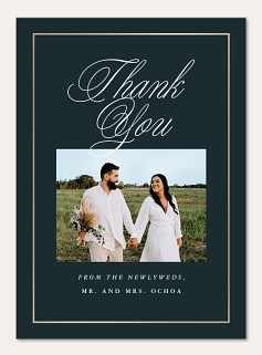 Express heartfelt gratitude with this sophisticated thank you card featuring elegant calligraphy and luxurious faux metallic accents. The classic navy design showcases your chosen photo within a refined golden frame, while traditional typography adds timeless appeal. Customize with premium cardstock options and personalized messages inside and out.