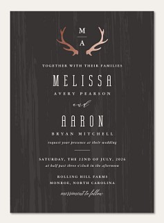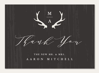 Express your gratitude with rustic sophistication through this striking thank you card featuring elegant antler motifs on a rich wood grain background. The dramatic contrast of crisp white typography against the dark backdrop creates a memorable woodland-inspired design. Customize with premium cardstock options and choice of luxurious finishes to perfectly convey your appreciation.