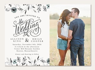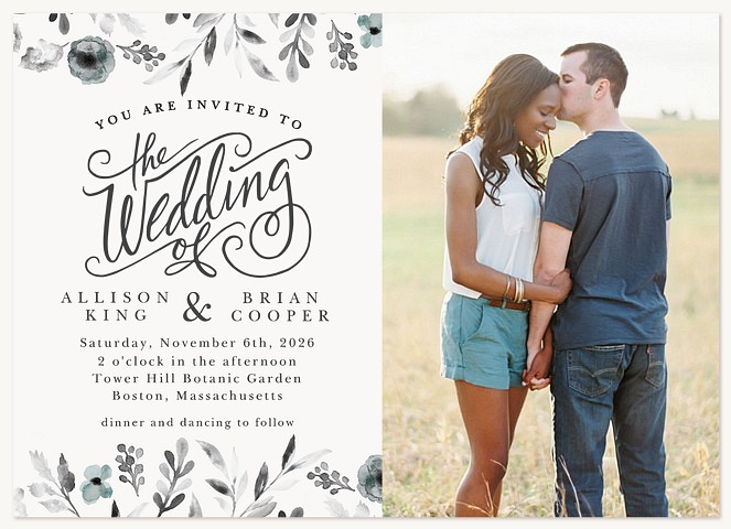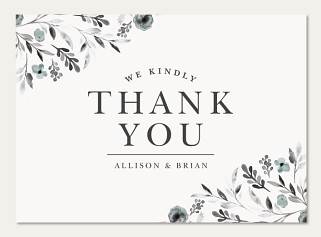 Express heartfelt gratitude with this sophisticated thank you card featuring delicate watercolor wildflowers in soft blue-grey hues. The elegant black typography creates a perfect balance with graceful floral sprays adorning the corners. Printed on premium cardstock with customizable interior and reverse side, this traditional design conveys sincere appreciation with timeless style.