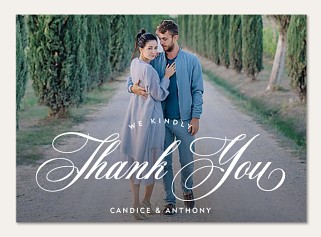 Express your gratitude with sophisticated style in this elegant thank you card featuring graceful script typography and refined design elements. The full-photo layout is enhanced by flowing calligraphy and subtle flourishes, creating a perfect balance of classic and contemporary appeal. Customize with your choice of premium cardstock finishes and add your personal touch to both inside and back.