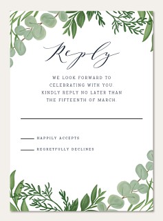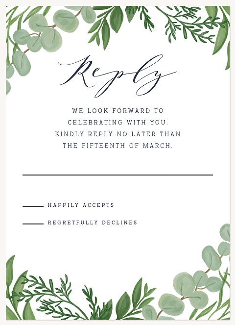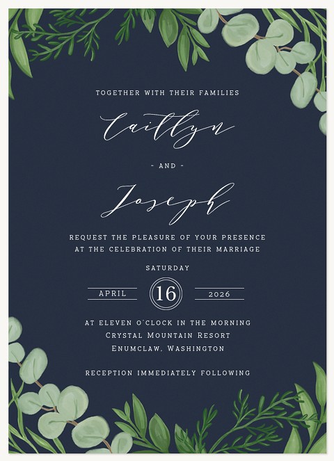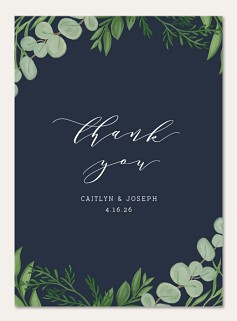 Express your gratitude with sophisticated style through this botanical thank you card featuring delicate watercolor foliage in soft greens against a deep navy background. The elegant script typography and natural corner frame create a timeless design that elevates your message. Customize with premium cardstock options and choice of finish.
