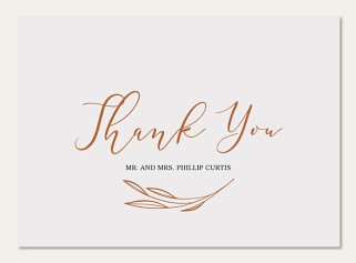 Express heartfelt gratitude with this elegantly designed thank you card featuring graceful copper calligraphy and a delicate botanical accent. The sophisticated minimalist layout pairs modern script with classic typography, creating a timeless look. Customize this premium folded card with your personal message on both inside and back, choosing from matte, glossy, or pearl shimmer finishes.