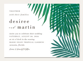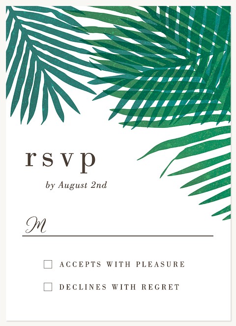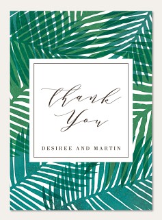 Express your gratitude with tropical sophistication through this striking thank you card. Lush watercolor palm fronds in rich emerald green frame an elegant white center panel with modern calligraphy. Printed on premium cardstock with customizable interior and reverse side, this design brings resort-worthy style to your heartfelt thanks.