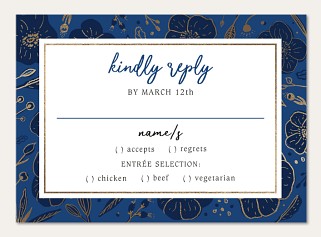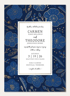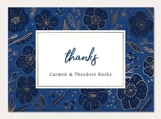 Express your gratitude with sophisticated style through this striking thank you card featuring luminous gold faux foiled florals against a rich navy background. The elegant botanical pattern frames your message with delicate blooms and leaves, while brush-lettered typography adds a personal touch. Customize this premium folded card with your choice of finishes and create a lasting impression.