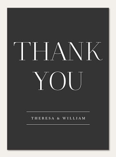 Express heartfelt gratitude with this sophisticated thank you card featuring striking serif typography on a rich charcoal background. The minimalist design with elegant double-line accents creates a timeless appeal. Customize this premium folded card with your personal message on luxurious cardstock in your choice of matte, glossy, or pearl shimmer finish.