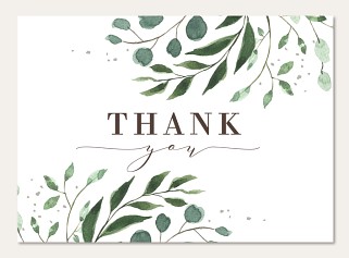 Express heartfelt gratitude with this elegant thank you card featuring delicate watercolor botanicals in soothing sage and forest greens. The sophisticated serif and flowing script typography creates a perfect balance with the organic scattered foliage frame. Printed on premium cardstock with customizable interior and reverse side.