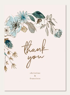 Express heartfelt gratitude with this artistically crafted thank you card featuring delicate watercolor florals in soft blues and greens. The elegant hand-brushed script flows gracefully among botanical illustrations on a blush pink background. Professionally printed on premium cardstock with customizable interior and finishing options.