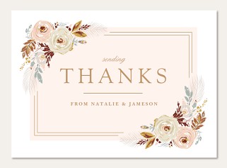 Express heartfelt gratitude with this enchanting thank you card featuring delicate watercolor blooms in soft peach and ivory tones. The sophisticated gold-framed design is adorned with graceful botanical corners on a gentle blush background. Customize this premium folded card with your personal message on both inside and back, choosing from our selection of luxurious finishes.