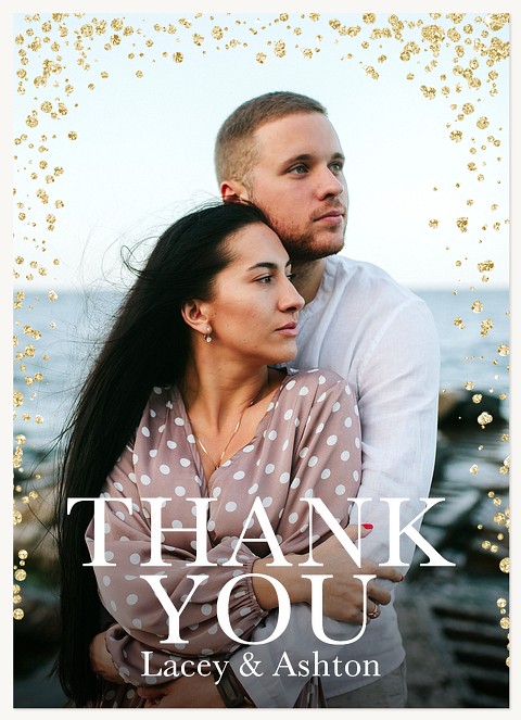 Make your wedding announcement sparkle with this elegant invitation featuring shimmering gold confetti cascading around your chosen image. The sophisticated serif typography and faux metallic accents create a timelessly romantic design. Customize with your preferred cardstock and choose from multiple premium finish options to perfectly capture your celebration's style.