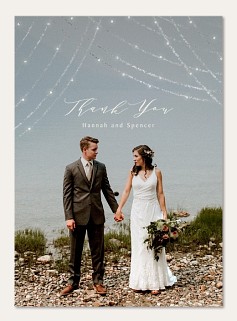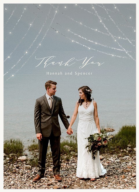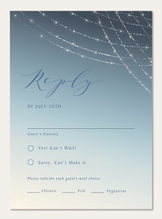 Capture the magic of twilight with this enchanting wedding invitation featuring cascading string lights in shimmering faux metallic against an ethereal blue-to-cream ombre background. The elegant combination of serif and script typography creates a sophisticated balance. Available on premium cardstock with customizable finishing options to perfectly set the tone for your celebration.
