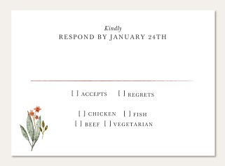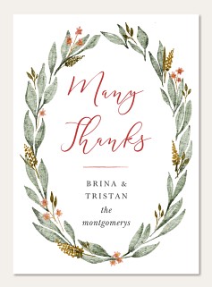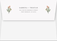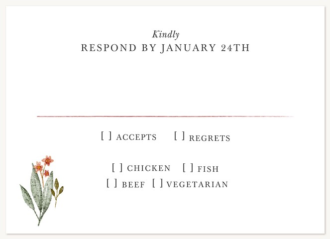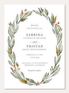 Frame your wedding details with timeless elegance in this botanical wedding invitation. A delicate watercolor wreath of sage leaves, coral blooms, and golden accents encircles your celebration details in classic serif typography. Printed on premium cardstock with customizable finishing options to perfectly capture your wedding day style.